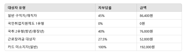 총 교육비는 **192,000원(교재비 포함)**이며, 개인 상황에 따라 자부담 비율이 달라집니다.