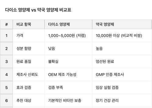 ✅ 반면 다이소 영양제는 원료 출처가 명확하지 않거나, 함량이 낮아 효과가 부족할 수 있음.