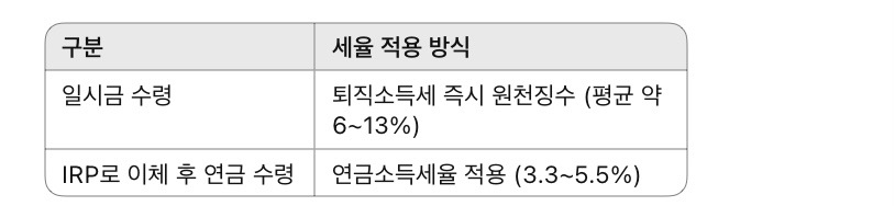 하지만 IRP로 이체하면, 퇴직소득세 납부가 연금 수령 시점으로 이연되며, 그때는 세율도 낮아집니다.