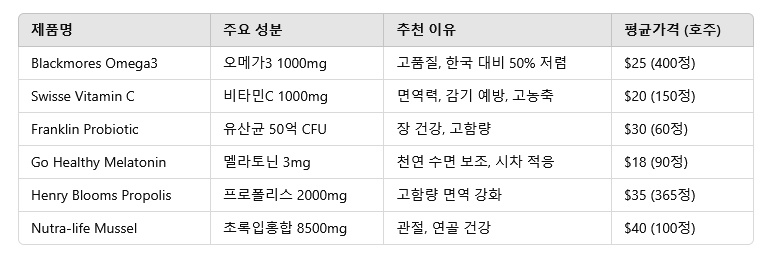 5. 호주 영양제 추천 리스트 표 (한눈에 정리)
