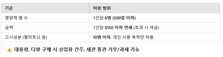 • 고시 성분 포함 제품 주의: 멜라토닌 등 일부 성분은 개인 사용 인정 범위 내 가능 (10병 이하, 처방서 없이)
