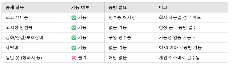 예:“회사에서 유니폼을 제공받았지만, 주 3회 집에서 세탁함→ 세탁비 연간 $150까지 공제 가능 (무증빙)