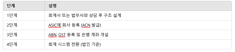 - 상호 등록: 개인 이름과 다른 상호를 사용하고 싶다면 ASIC에서 사업자명을 등록해야 합니다.