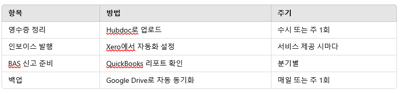 - 초반부터 Xero, QuickBooks, MYOB 등 클라우드 회계 소프트웨어를 연동해두면 장기적으로 BAS 신고, 세금 정리에 매우 유리합니다.