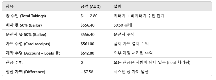 • 현금 수령 (Cash collected): 실질 수령 없음 (모두 차량 float로 유지됨)