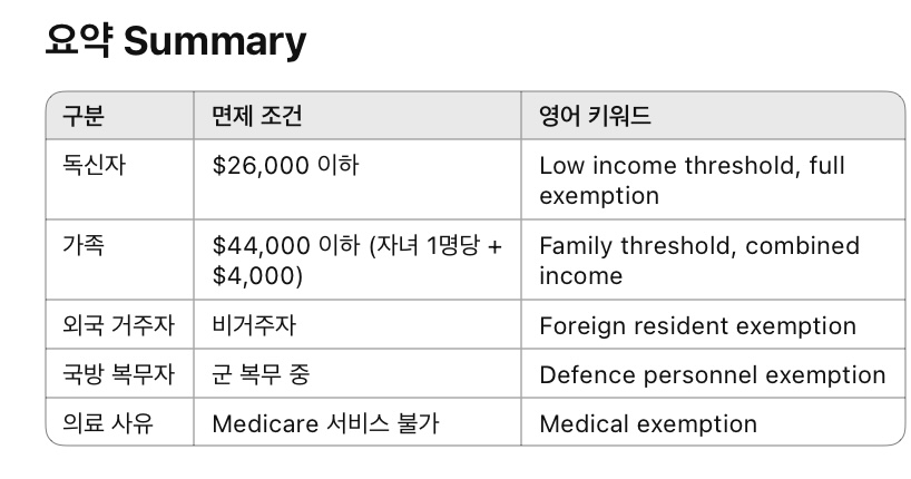 • Foreign Resident (외국 거주자): 호주에서 tax resident가 아닌 경우 Medicare Levy 전액 면제.