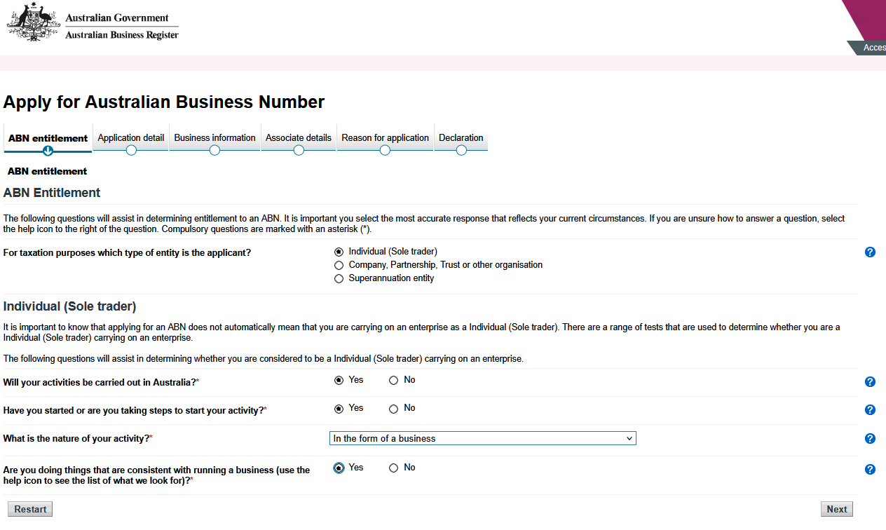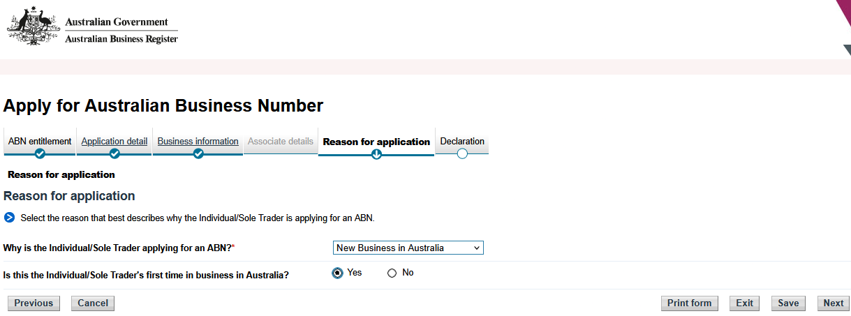 • ABN 신청 사유: New Business in Australia