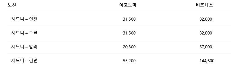 • 멜버른-시드니: 5,400포인트 (이코노미 → 비즈니스)